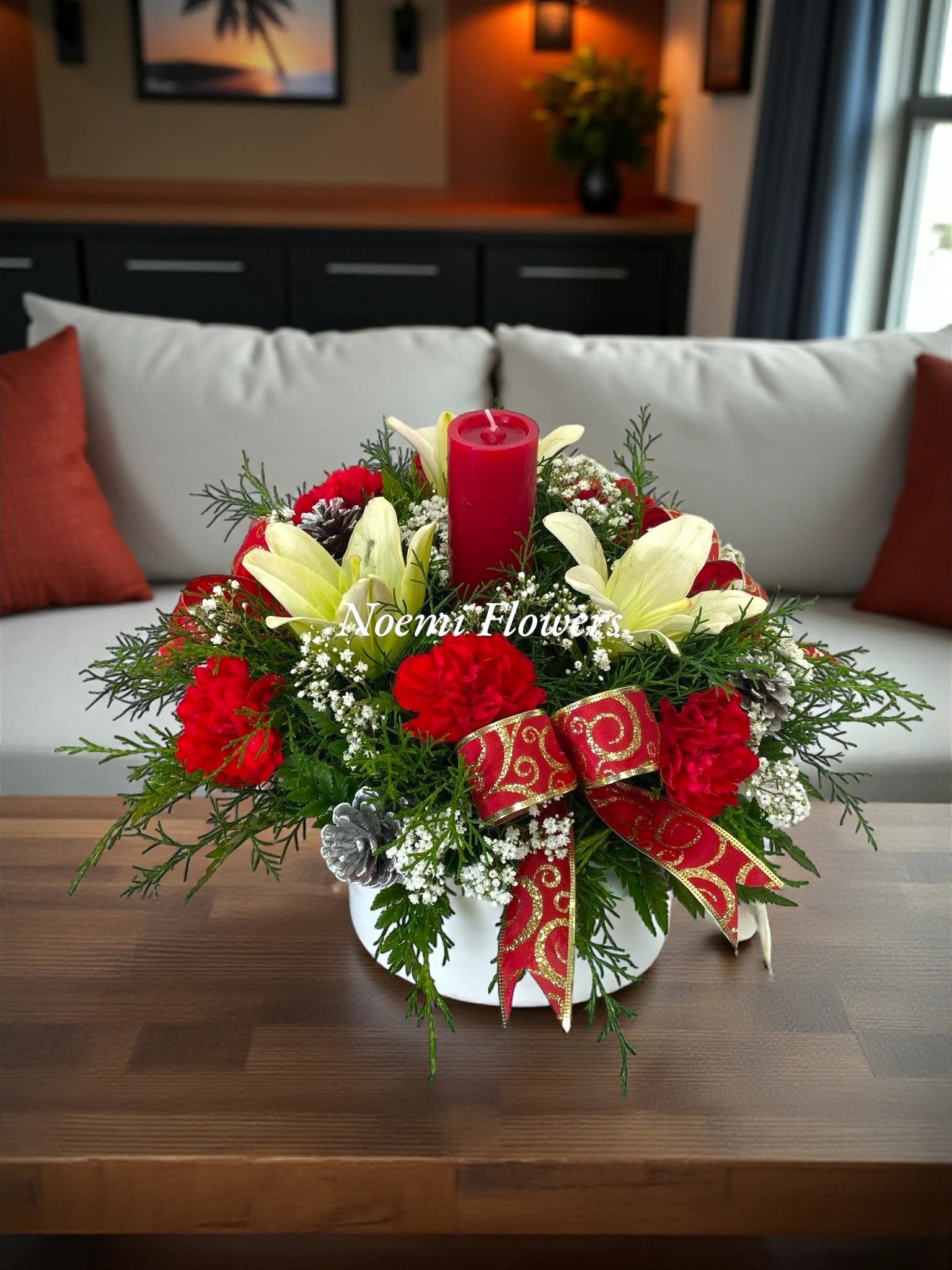 Ilumina tu mesa navideña con este elegante centro de mesa que combina la frescura de los lirios blancos, la calidez de los claveles y el aroma del pino natural.