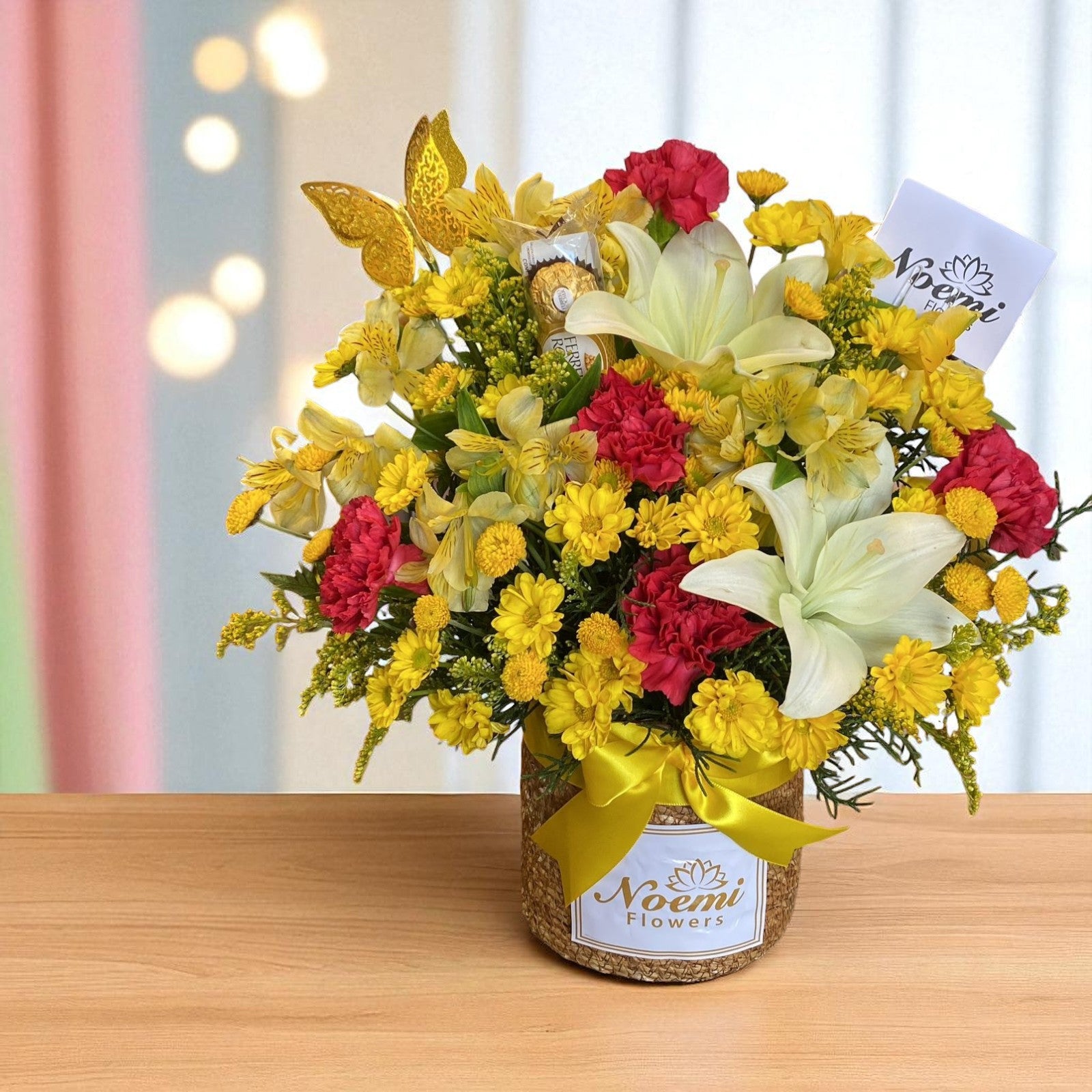 Esta caja pequeña contiene una variada selección de flores como lirios, claveles, margaritas variadas y astromelias, acompañados con follaje variado y Ferrero Rocher de 3 unidades. Caja puede variar de color, según disponibilidad.